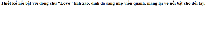 Thiết kế nổi bật với dòng chữ “Love” tinh xảo, đính đá sáng nhẹ viền quanh, mang lại vẻ nổi bật cho đôi tay. Đầy đủ giấy bảo hành và cam kết bảo đảm chất lượng sản phẩm OLWEN FINE JEWELRY – Chúng tôi chuyên: ️ Thiết kế & chế tác trang sức theo yêu cầu ️ Tài trợ vương miện & trang sức đồng hành cùng các sân chơi nhan sắc – tài năng ️ Sở hữu đội ngũ thiết kế – kim hoàn lành nghề, am hiểu xu hướng và giá trị biểu tượng