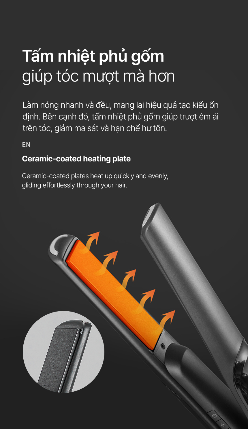 - TẤM NHIỆT PHỦ GỐM: Làm nóng nhanh và đều, mang lại hiệu quả tạo kiểu ổn định. Bên cạnh đó, tấm nhiệt phủ gốm giúp trượt êm ái trên tóc, giảm ma sát và hạn chế hư tổn