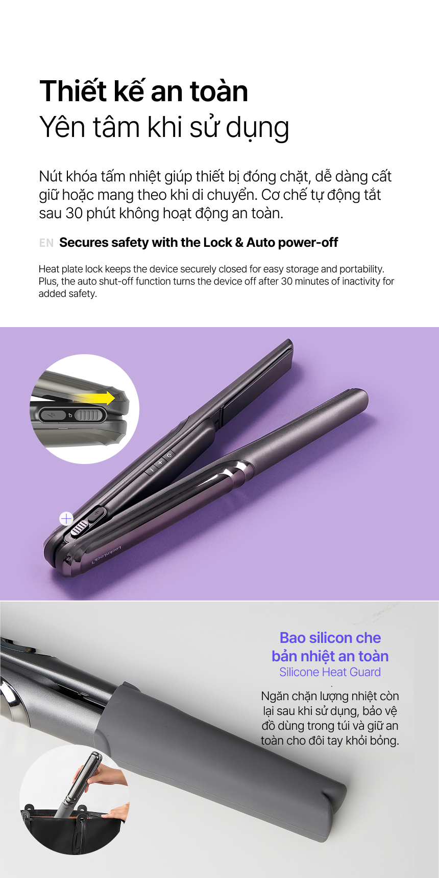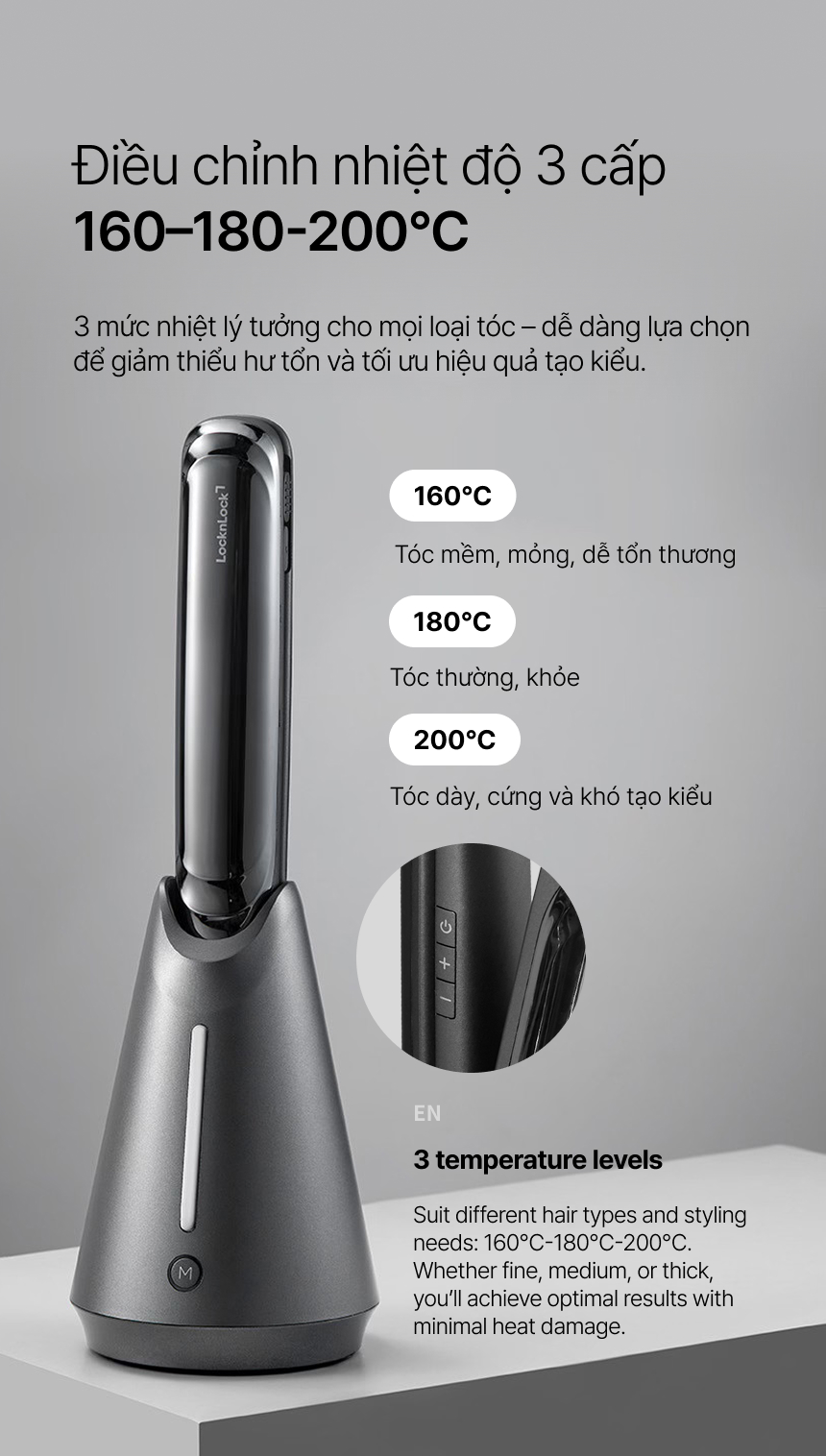 - 3 MỨC NHIỆT ĐỘ:160°C – 180°C – 200°C, phù hợp với mọi loại tóc: mỏng, trung bình hoặc dày – tạo kiểu hiệu quả mà vẫn hạn chế hư tổn do nhiệt.