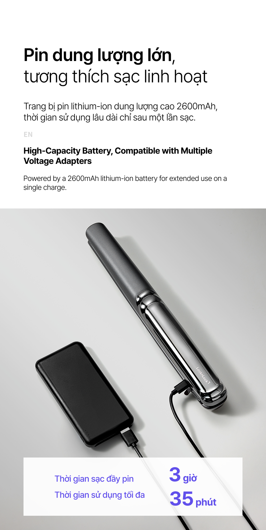 - PIN SẠC LI-ION: Trang bị pin lithium-ion dung lượng cao 2600mAh, thời gian sử dụng lâu dài chỉ sau một lần sạc.