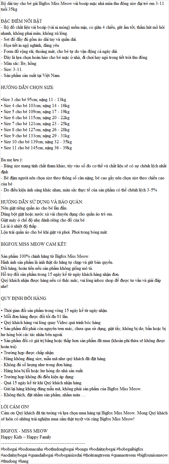 | Bộ dài tay cho bé gái Bigfox Miss Meow vải bozip mặc nhà mùa thu đông size đại trẻ em 3-11 tuổi 35kg ĐẶC ĐIỂM NỔI BẬT - Bộ đồ chất liệu vải bozip (vải nỉ mỏng) mềm mịn, co giãn 4 chiều, giữ ấm tốt, thấm hút mồ hôi nhanh, không phai màu, không xù lông. - Set đồ đầy đủ gồm áo dài tay và quần dài. - Họa tiết in ngộ nghĩnh, đáng yêu. - Form đồ rộng rãi, thoáng mát, cho bé tự do vận động cả ngày dài. - Đây là lựa chọn hoàn hảo cho bé mặc ở nhà, đi chơi hay ngủ trong tiết trời thu đông - Màu sắc: Be, hồng - Size: 3-11. - Sản phẩm sản xuất tại Việt Nam. HƯỚNG DẪN CHỌN SIZE: •Size 3 cho bé 95cm; nặng 11 - 13kg • Size 4 cho bé 103cm; nặng 14 - 16kg • Size 5 cho bé 109cm; nặng 17 - 19kg • Size 6 cho bé 115cm; nặng 20 - 22kg • Size 7 cho bé 121cm; nặng 23 - 25kg • Size 8 cho bé 127cm; nặng 26 - 28kg • Size 9 cho bé 133cm; nặng 29 - 31kg • Size 10 cho bé 139cm; nặng 32 - 35kg • Size 11 cho bé 145cm; nặng 36 - 39kg Ba mẹ lưu ý: - Bảng size mang tính chất tham khảo, tùy vào số đo cơ thể và chất liệu sẽ có sự chênh lệch nhất định - Bé đậm người nên chọn size theo thông số cân nặng, bé cao gầy nên chọn size theo chiều cao của bé - Do điều kiện ánh sáng khác nhau, màu sắc thực tế của sản phẩm có thể chênh lệch 3-5% HƯỚNG DẪN SỬ DỤNG VÀ BẢO QUẢN: Nên giặt riêng quần áo cho bé lần đầu. Dùng bột giặt hoặc nước xả vải chuyên dụng cho quần áo trẻ em. Giặt máy ở chế độ nhẹ dành riêng cho đồ của bé . Là ủi ở nhiệt độ thấp . Lộn trái quần áo cho bé khi giặt và phơi. Phơi trong bóng mát. BIGFOX MISS MEOW CAM KẾT: Sản phẩm 100% chính hãng từ Bigfox Miss Meow. Hình ảnh sản phẩm là ảnh thật do hãng tự chụp và giữ bản quyền. Đổi hàng, hoàn tiền nếu sản phẩm không giống mô tả. Hỗ trợ đổi sản phẩm trong 15 ngày kể từ ngày khách hàng nhận đơn. Quý khách nhận được hàng nếu có thắc mắc, vui lòng inbox shop để được tư vấn và giải đáp nhé! QUY ĐỊNH ĐỔI HÀNG • Thời gian đổi sản phẩm trong vòng 15 ngày kể từ ngày nhận. • Mỗi đơn hàng được đổi tối đa 01 lần. • Quý khách hàng vui lòng quay Video quá trình bóc hàng • Sản phẩm đổi phải còn nguyên tem mác, chưa qua sử dụng, giặt tẩy, không bị dơ, bẩn hoặc bị hư hỏng bởi các tác nhân bên ngoài. • Sản phẩm đổi có giá trị bằng hoặc thấp hơn sản phẩm đã mua (khoản phí thừa sẽ không được hoàn trả). • Trường hợp được chấp nhận: - Hàng không đúng size, mẫu mã như quý khách đã đặt hàng. - Không đủ số lượng như trong đơn hàng. - Hàng hóa bị lỗi hoặc hư hỏng do nhà sản xuất. • Trường hợp không đủ điều kiện áp dụng: - Quá 15 ngày kể từ khi Quý khách nhận hàng. - Gửi lại hàng không đúng mẫu mã, không phải sản phẩm của Bigfox Miss Meow. - Không thích, đặt nhầm sản phẩm, nhầm màu … LỜI CẢM ƠN! Cảm ơn Quý khách đã tin tưởng và lựa chọn mua hàng tại Bigfox Miss Meow. Mong Quý khách sẽ luôn có những trải nghiệm mua sắm thật tuyệt vời cùng Bigfox Miss Meow! BIGFOX - MISS MEOW Happy Kids – Happy Family ------------------------------------------------- #bobegai #bodomacnha #bothudongbegai #bongu #bodaitaybegai #bobegaibigfox #aodaitaybegai #quandaibegai #bobegaisizedai #thoitrangtreem #quanaotreem #bigfoxmissmeow #thudong #hang