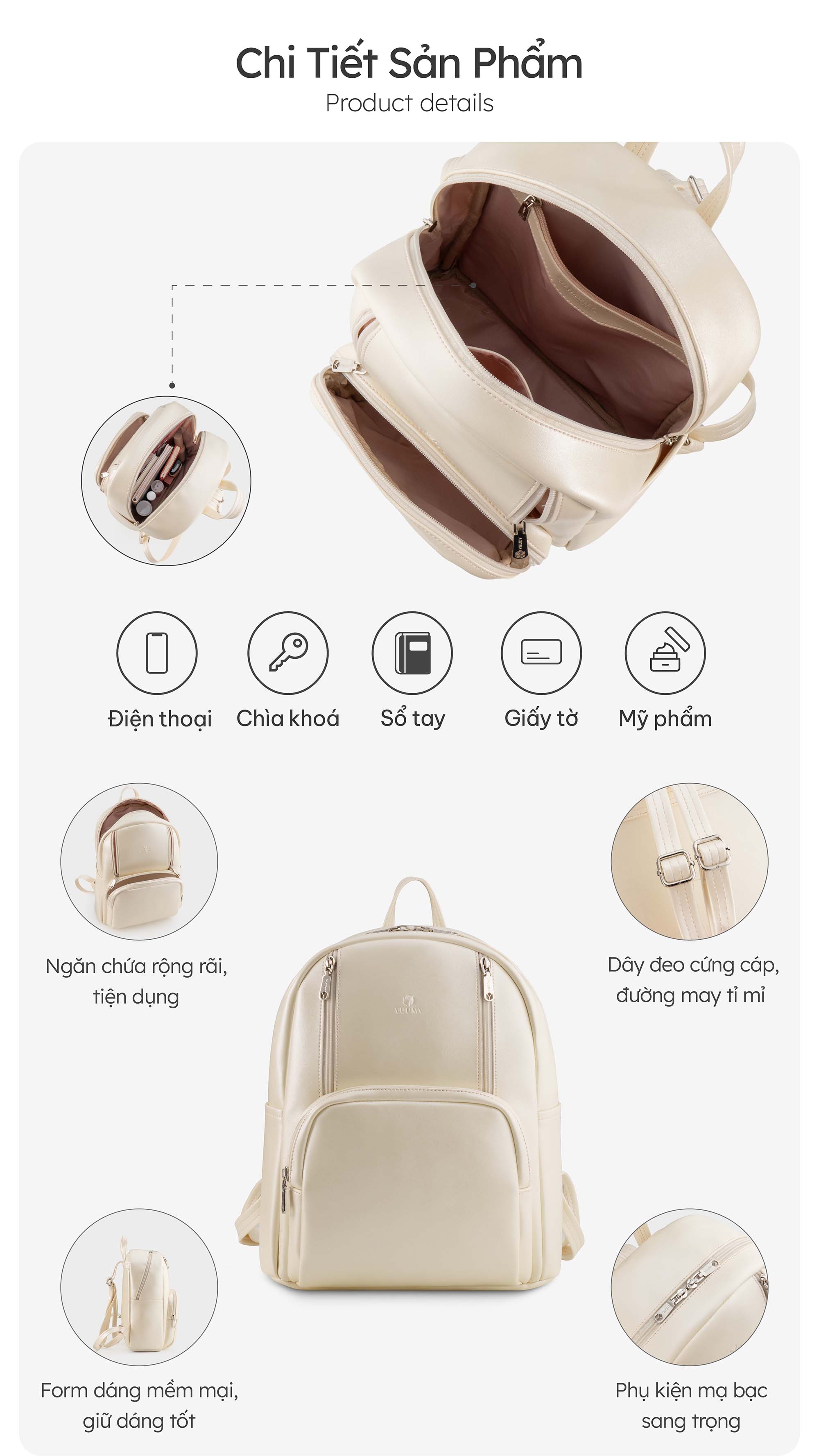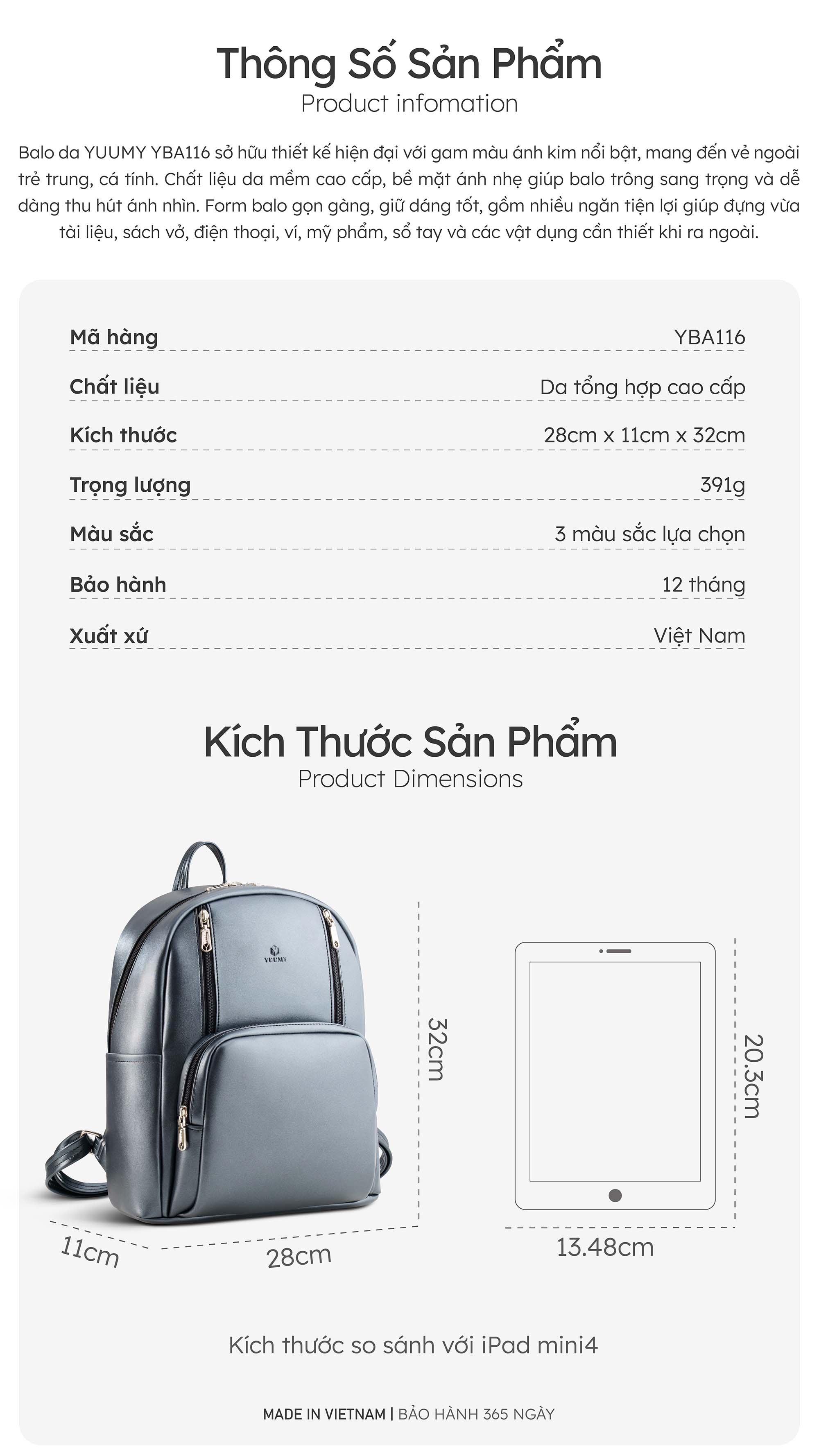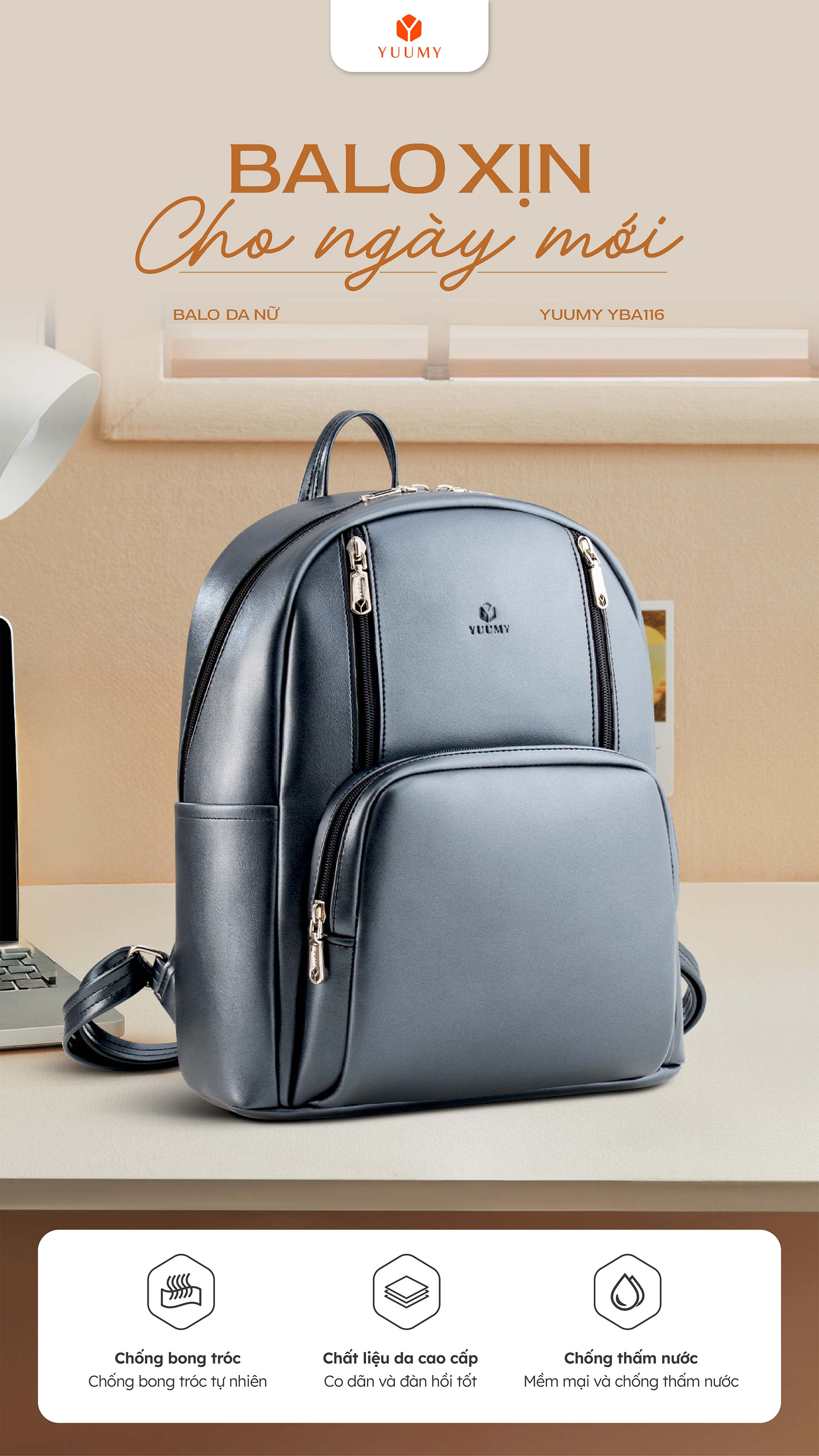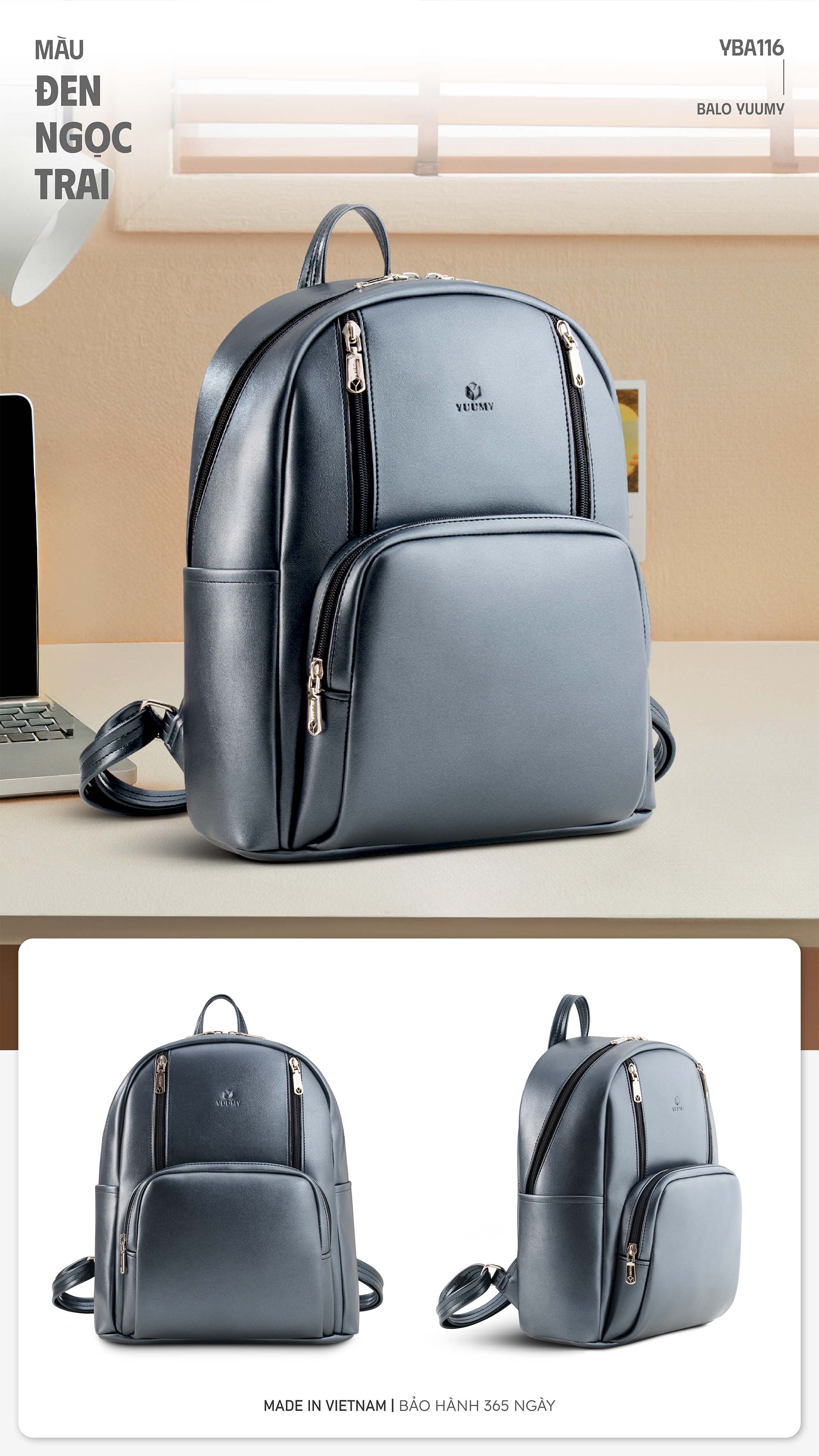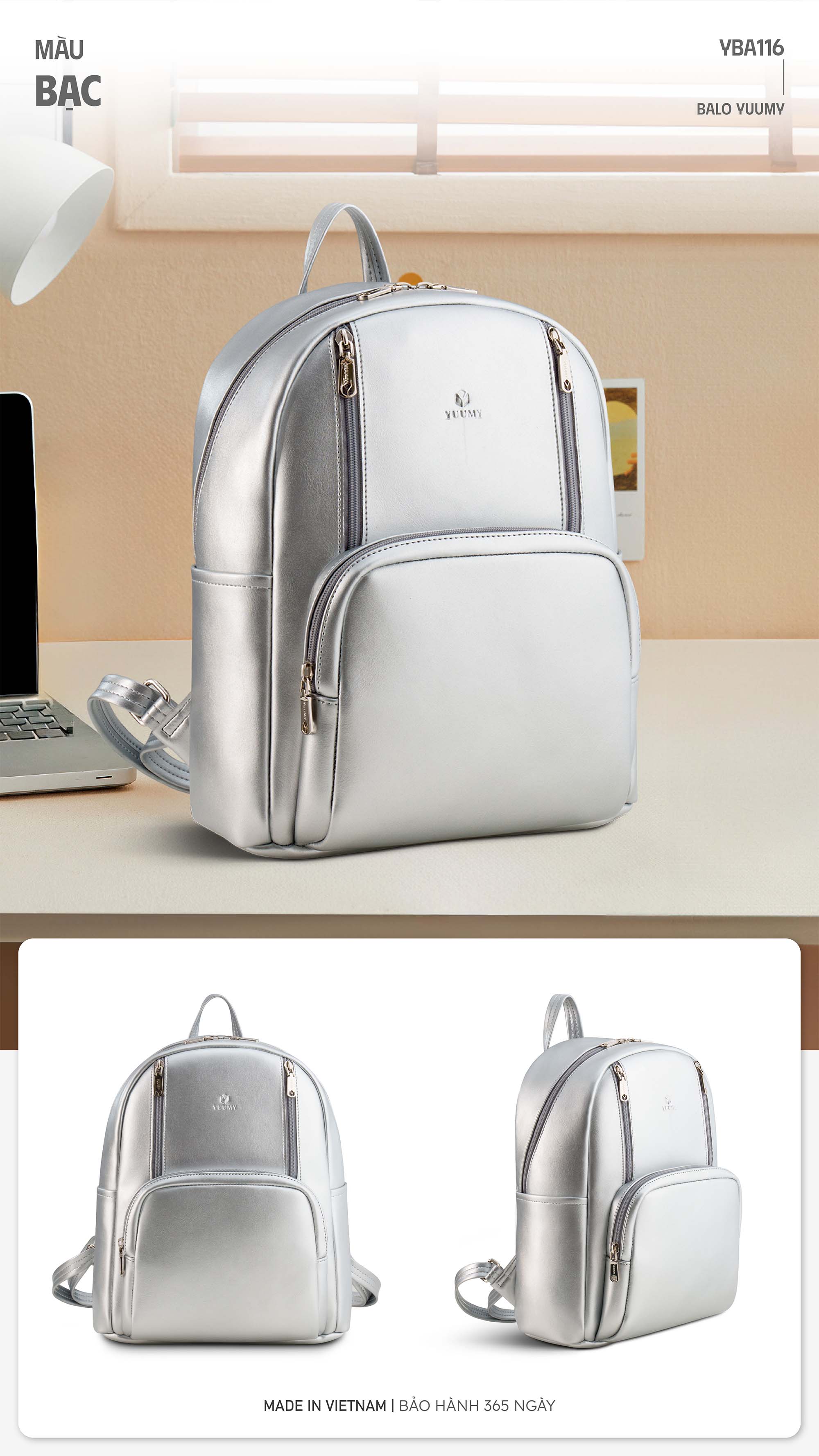 Balo da YUUMY YBA116 sở hữu thiết kế hiện đại với gam màu ánh kim nổi bật, mang đến vẻ ngoài trẻ trung, cá tính. Chất liệu da mềm cao cấp, bề mặt ánh nhẹ giúp balo trông sang trọng và dễ dàng thu hút ánh nhìn. Form balo gọn gàng, giữ dáng tốt, gồm nhiều ngăn tiện lợi giúp đựng vừa tài liệu A4, sách vở, điện thoại, ví, mỹ phẩm, sổ tay và các vật dụng cần thiết khi ra ngoài. Phần dây đeo chắc chắn, êm vai, có thể điều chỉnh linh hoạt, phù hợp cho việc đi học, đi làm hay dạo phố.