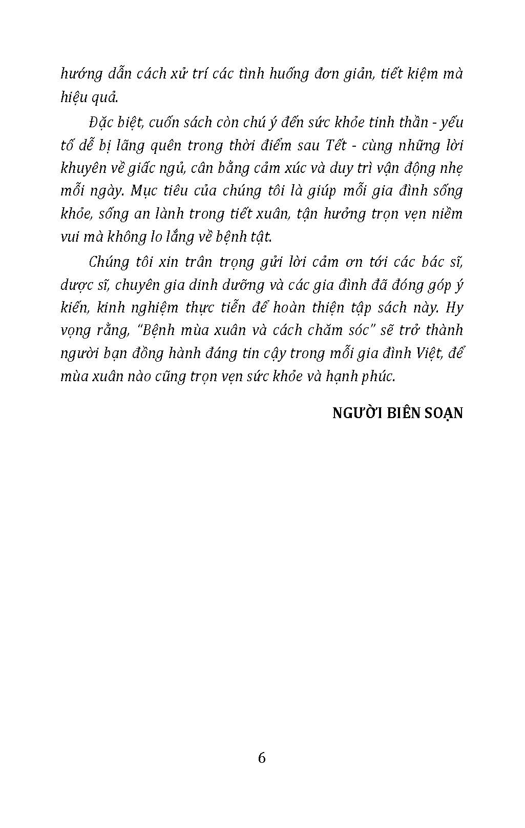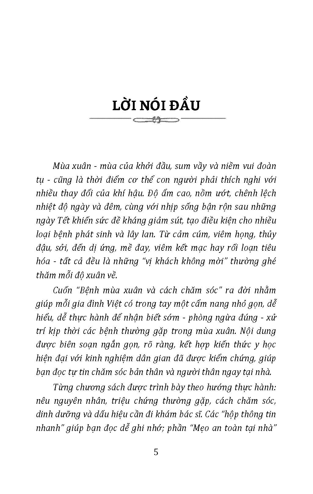 Cẩm nang sức khỏe dễ hiểu, dễ thực hành để nhận biết sớm, phòng ngừa đúng và xử trí kịp thời các bệnh thường gặp trong mùa xuân, kết hợp kiến thức y học hiện đại với kinh nghiệm dân gian đã được kiểm chứng, giúp mỗi người có thể tự chăm sóc bản thân và người thân ngay tại nhà, giúp mỗi gia đình sống khỏe, sống an lành trong tiết xuân, tận hưởng trọn vẹn niềm vui mà không lo lắng về bệnh tật.