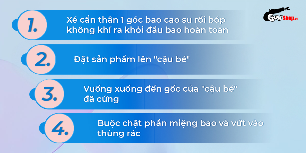 ✪ Cách dùng: Cẩn thận xé 1 góc bao cao su rồi bóp không khí ra khỏi đầu bao, sau đó đặt bao vào đầu rồi vuốt xuống đến gốc. Sau khi quan hệ xong giữ đầu bao rồi từ từ rút "cậu bé" ra tránh làm tràn tinh dịch. Thắt miệng bao rồi vứt vào thùng rác.