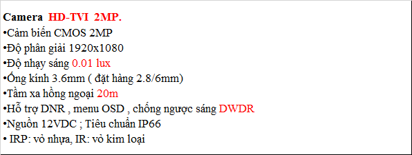 Camera HD-TVI 2MP. •Cảm biến CMOS 2MP •Độ phân giải 1920x1080 •Độ nhạy sáng 0.01 lux •Ống kính 3.6mm ( đặt hàng 2.8/6mm) •Tầm xa hồng ngoại 20m •Hỗ trợ DNR , menu OSD , chống ngược sáng DWDR •Nguồn 12VDC ; Tiêu chuẩn IP66 • IRP: vỏ nhựa, IR: vỏ kim loại