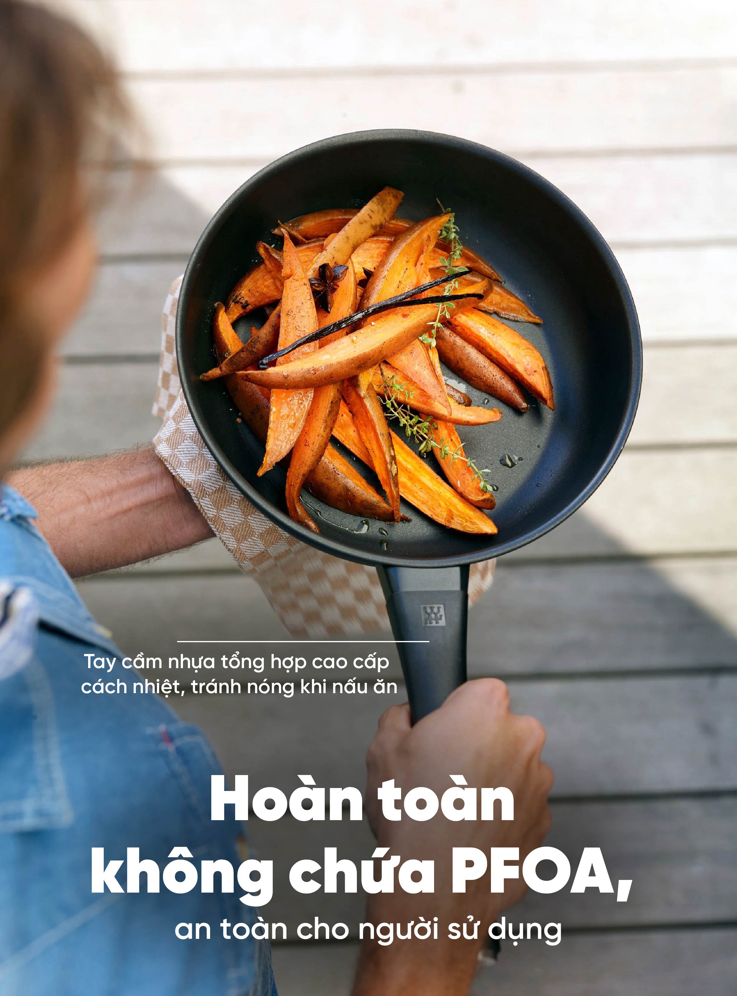 Ngoài ra, sản phẩm hoàn toàn không chứa PFOA, niken hay bất kỳ kim loại nặng nào, giúp bảo vệ sức khỏe người dùng khỏi các chất độc hại tiềm ẩn. Với tính năng chống dính và bề mặt bền bỉ, sản phẩm mang lại trải nghiệm nấu nướng dễ dàng và an toàn, đồng thời giúp tiết kiệm thời gian vệ sinh sau khi sử dụng. Đây là sự lựa chọn lý tưởng cho những ai quan tâm đến cả chất lượng và sức khỏe khi sử dụng dụng cụ nhà bếp.