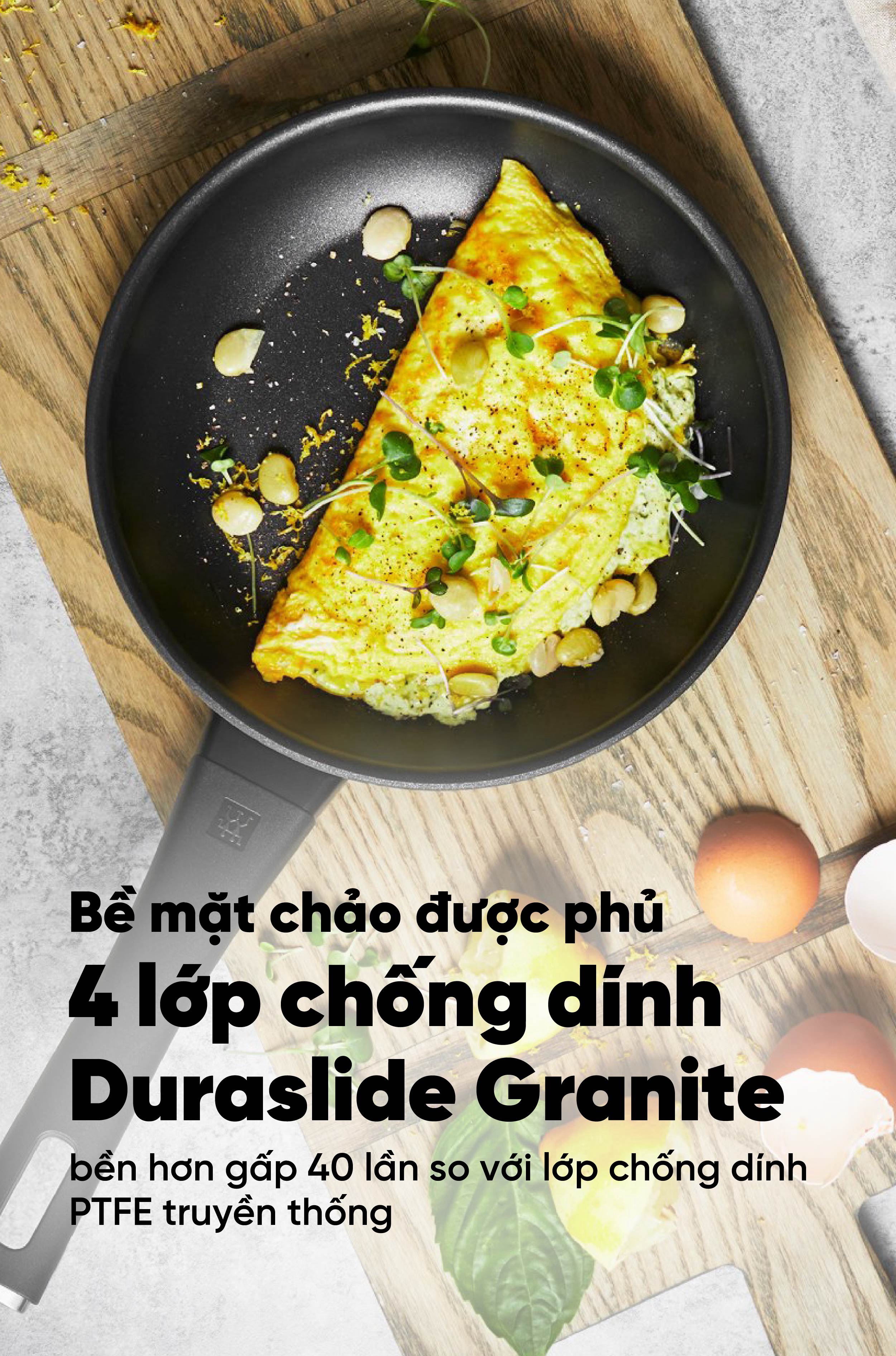 Sản phẩm được làm từ nhôm độc quyền cao cấp của thương hiệu Zwilling. Mặt chảo được phủ lớp Plasma Primer, giúp bảo vệ bề mặt khỏi trầy xước và giảm thiểu mài mòn trong suốt quá trình sử dụng. Điều này không chỉ gia tăng tuổi thọ của sản phẩm mà còn giữ cho nó luôn mới mẻ, sáng bóng. Đặc biệt, bề mặt chống dính đa lớp Duraslide Granite mang đến khả năng chống dính mạnh mẽ, bền gấp 40 lần so với các lớp chống dính PTFE truyền thống, đảm bảo hiệu suất sử dụng lâu dài.