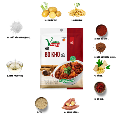 Xốt gia vị bò kho Vianco giúp rút ngắn thời gian bằng cách thêm trực tiếp vào nước dùng, tạo thêm màu và mùi vị đặc trưng của bò kho ngay lúc thêm vào nước dùng.