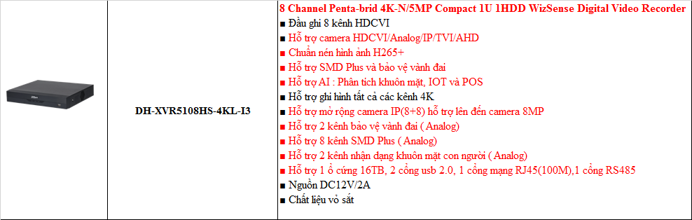 | DH-XVR5108HS-4KL-I3 | 8 Channel Penta-brid 4K-N/5MP Compact 1U 1HDD WizSense Digital Video Recorder ■ Đầu ghi 8 kênh HDCVI ■ Hỗ trợ camera HDCVI/Analog/IP/TVI/AHD ■ Chuẩn nén hình ảnh H265+ ■ Hỗ trợ SMD Plus và bảo vệ vành đai ■ Hỗ trợ AI : Phân tích khuôn mặt, IOT và POS ■ Hỗ trợ ghi hình tất cả các kênh 4K ■ Hỗ trợ mở rộng camera IP(8+8) hỗ trợ lên đến camera 8MP ■ Hỗ trợ 2 kênh bảo vệ vành đai ( Analog) ■ Hỗ trợ 8 kênh SMD Plus ( Analog) ■ Hỗ trợ 2 kênh nhận dạng khuôn mặt con người ( Analog) ■ Hỗ trợ 1 ổ cứng 16TB, 2 cổng usb 2.0, 1 cổng mạng RJ45(100M),1 cổng RS485 ■ Nguồn DC12V/2A ■ Chất liệu vỏ sắt